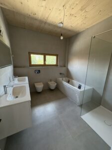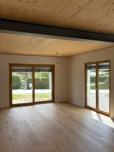 Zunanja izolacija iz celuloze in lesnih vlaken, zrakotesna izvedba, toplotna črpalka in rekuperacija – za udobno in varčno bivanje.